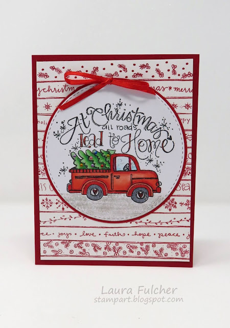 After coloring the truck with Copic markers, I layered my scene onto a background I stamped with one of the IO backgrounds and added a few rhinestones to the tree for extra bling.